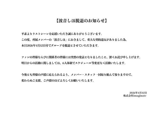【ラストシーン】波音しほメンバー脱退のお知らせ。一体なぜ?